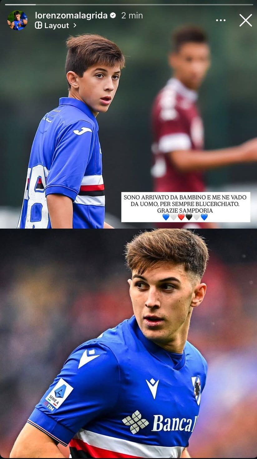 Una storia che lo ritrae prima bambino, poi in Serie A. E la scritta: “Sono arrivato da bambino, me ne vado da uomo. Per sempre blucerchiato, grazie Sampdoria”.