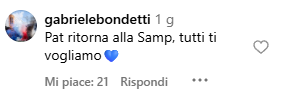 Nei commenti sotto al suo reel dove mostra i suoi allenamenti, i tifosi non si sono fatti desiderare parecchi commenti che chiedevano di tornare a Genova, alcuni hanno taggato Andrea Mancini e il Ceo Jesper Fredberg chiedendogli di riportarlo a casa. Pajtim Kasami è legato alla Sampdoria come i tifosi sono legati a lui, presente anche nella gara d’andata dei playout contro la Salernitana. Ecco alcuni commenti:
