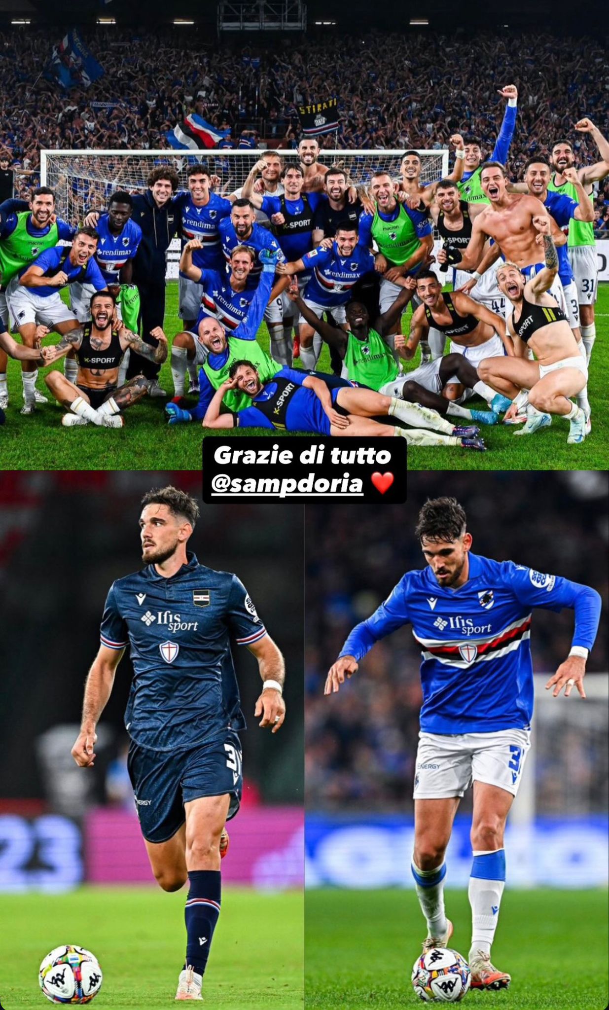Un collage di foto; una di gruppo, una con la maglia jeans e l’altra con quella più bella del Mondo. E una scritta semplice quanto però importante: “Grazie di tutto Sampdoria”, accompagnato da un cuore rosso. Un senso di riconoscenza che, ripeto, non è stato da tutti in questo mercato di gennaio…