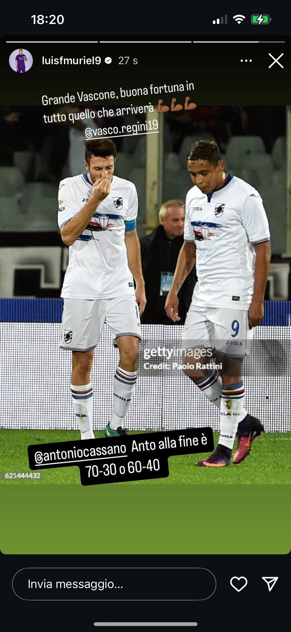 Sui social, l’ex attaccante della Sampdoria Luis Muriel ha salutato Vasco Regini dopo la sua decisione di dire addio al calcio giocato.