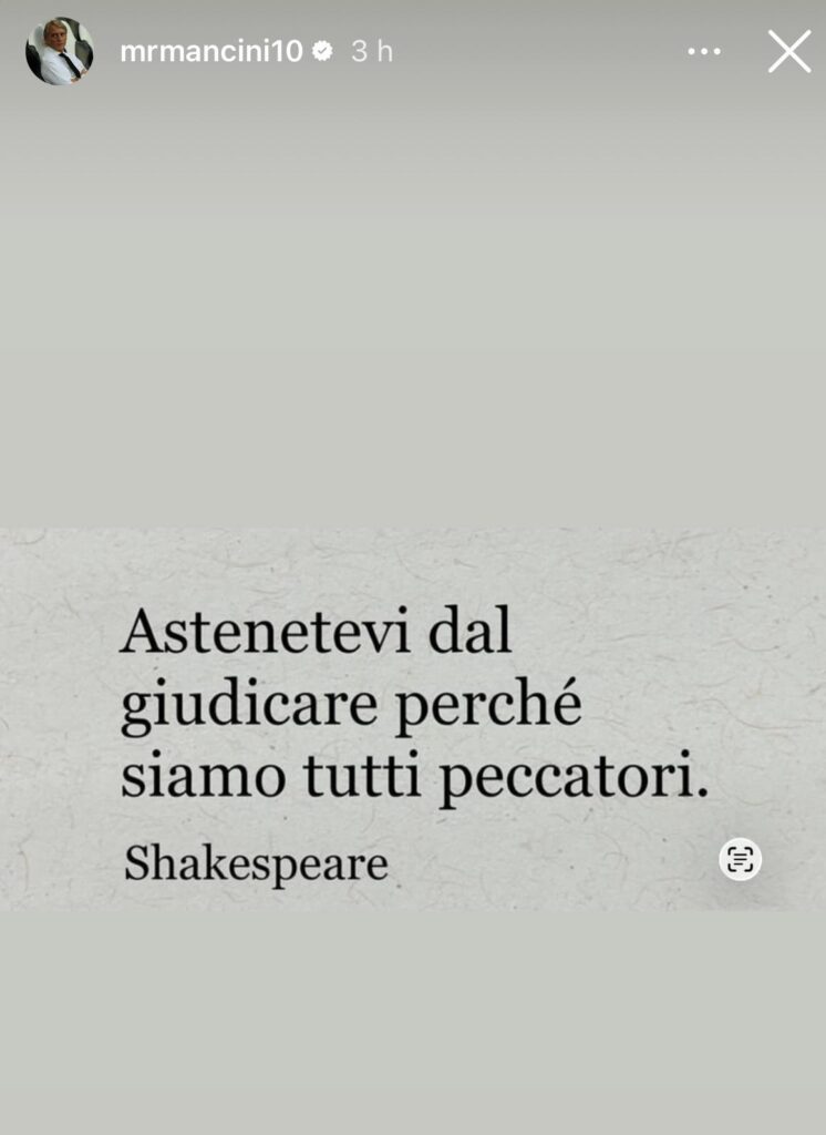 L’ex giocatore della Sampdoria, citando William Shakespeare, ha pubblicato la frase “Astenetevi dal giudicare perché siamo tutti peccatori“. Una specie di monito che va contro a chi ha mosso alcune critiche senza aver titolo di farlo, secondo quello che sembra sostenere Mancini.