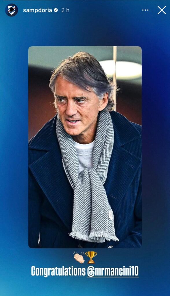 Sui propri account social la Sampdoria ha pubblicato una story che raffigura Mancini in visita al Luigi Ferraris e gli ha fatto le “congratulazioni”, allegando l’emoji dell’applauso e del trofeo.