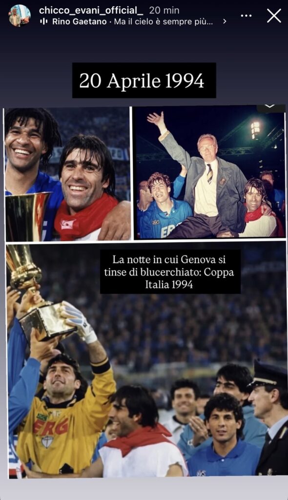 Chicco Evani ha poi allegato alla story la canzone “Ma il cielo è sempre più blu” di Rino Gaetano, colonna sonora di fine partita di tutti i successi della Sampdoria. E infine l’ex tecnico ha scritto “La notte in cui Genova si tinse di blucerchiato“. L’ultima notte in cui la squadra, verso quel cielo, ha alzato le mani, le voci a festa e un trofeo.
