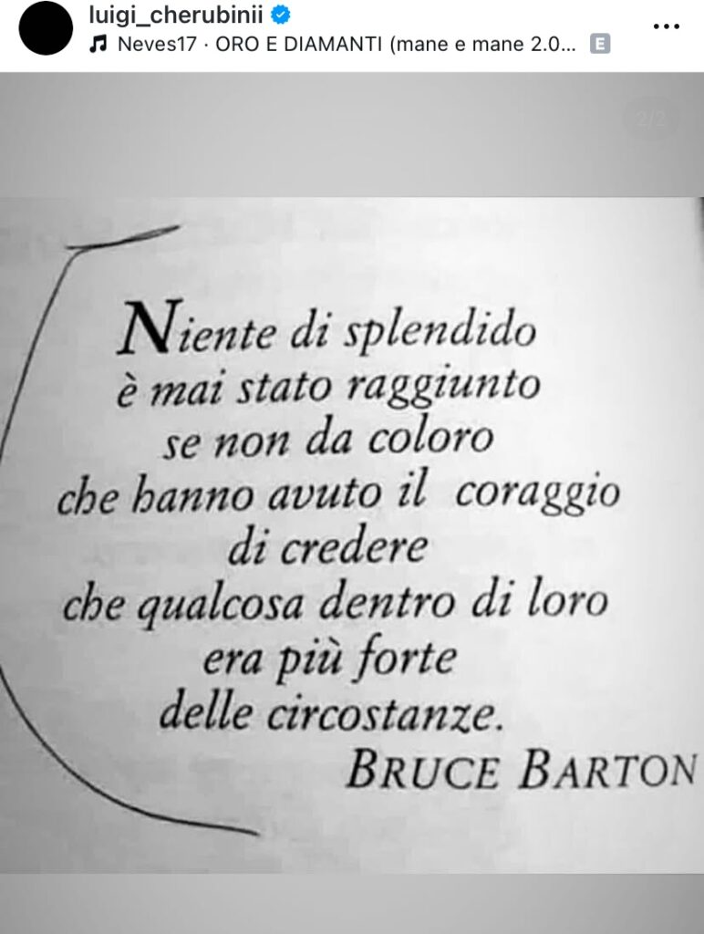 Cherubini ha postato una foto che riporta una frase di Bruce Barton, storico scrittore e politico americano, in cui si legge che