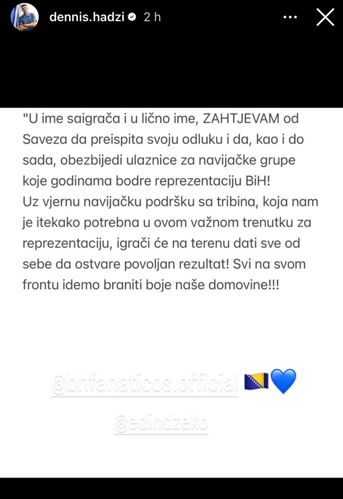 A nome dei miei compagni di squadra e a nome mio, CHIEDO alla Federazione di riconsiderare la sua decisione e, come in precedenza, di fornire i biglietti ai gruppi di tifosi che da anni tifano per la nazionale della Bosnia-Erzegovina!