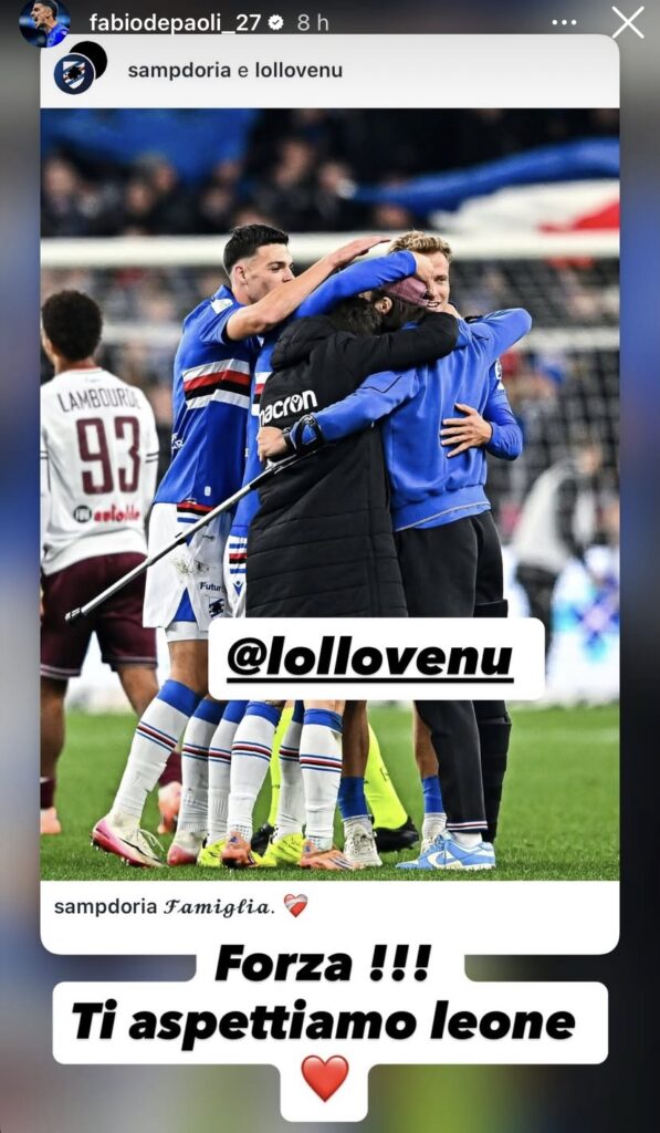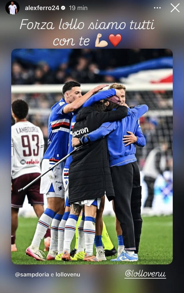 Ricondividendo quello scatto nelle sue stories di Instagram, Ricci ha scritto a Venuti “Forza leone“, epiteto usato anche da Depaoli: “Forza! Ti aspettiamo leone“. Mentre Ferrari ha espresso la vicinanza della squadra al difensore ex Lecce e Fiorentina: “Forza Lollo siamo tutti con te“.