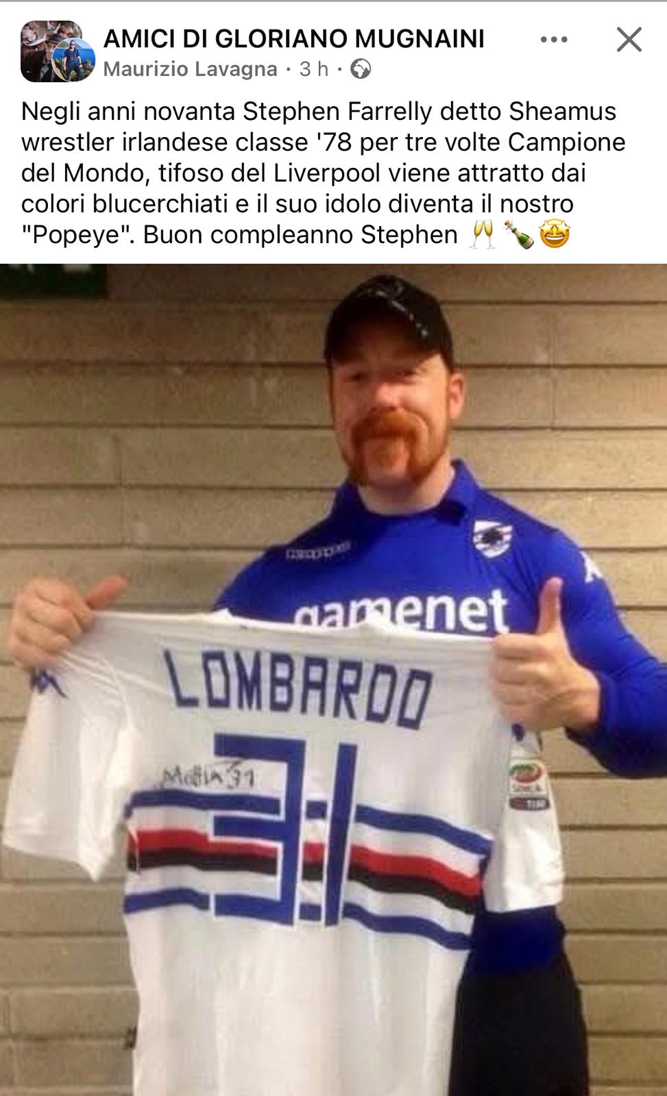 I colori della Sampdoria fanno innamorare anche oltreoceano o anche oltre il canale della Manica. Il motivo è semplice e riporta a Stephen Farrelly che detto così non suscita granchè, in quanto è conosciuto in tutto il mondo con il ring name di Sheamus atleta sotto contratto con la WWE. Tre volte campione del mondo dei pesi massimi e tra i più amati dal pubblico che segue questo sport spettacolo.