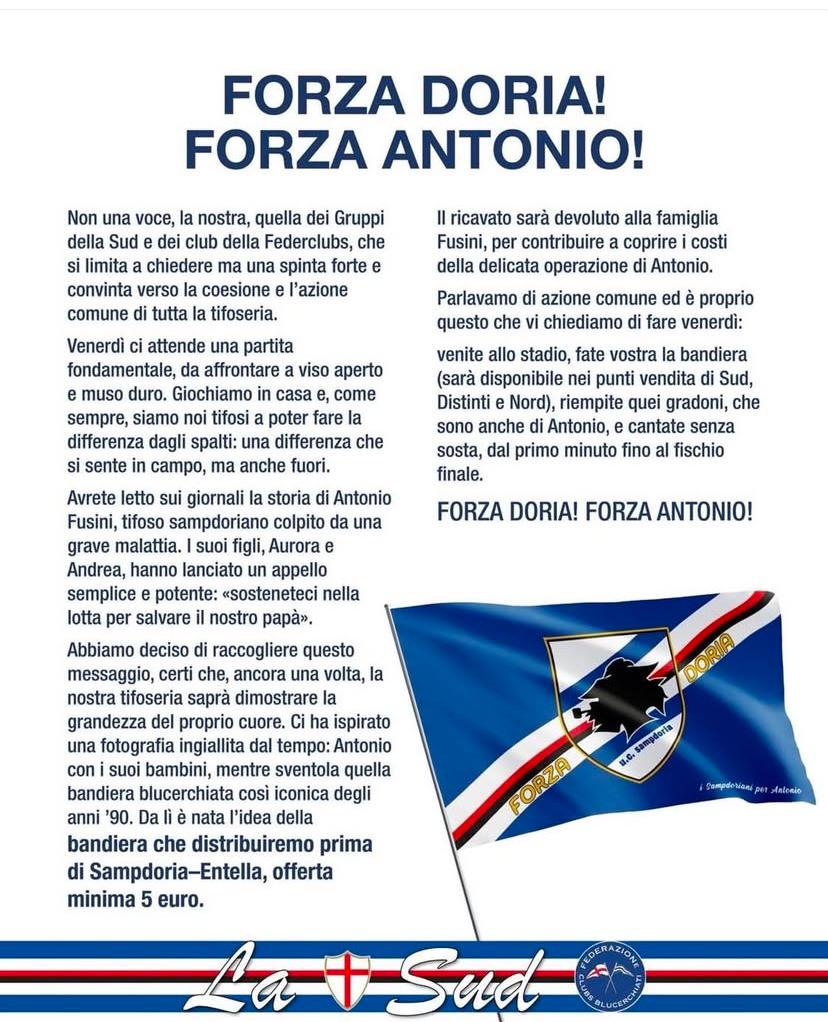 La Sud è vicina ad Antonio, un tifoso della Sampdoria malato e che ha bisogno di una mano in questo momento e i tifosi ci sono…