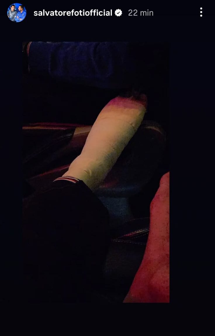 “Incidente” sul lavoro per Salvatore Foti che, sul proprio profilo Instagram, ha pubblicato una storia, un’immagine in cui appare con il piede fasciato sul pullman che riporta la sua Sampdoria verso casa, a Genova.