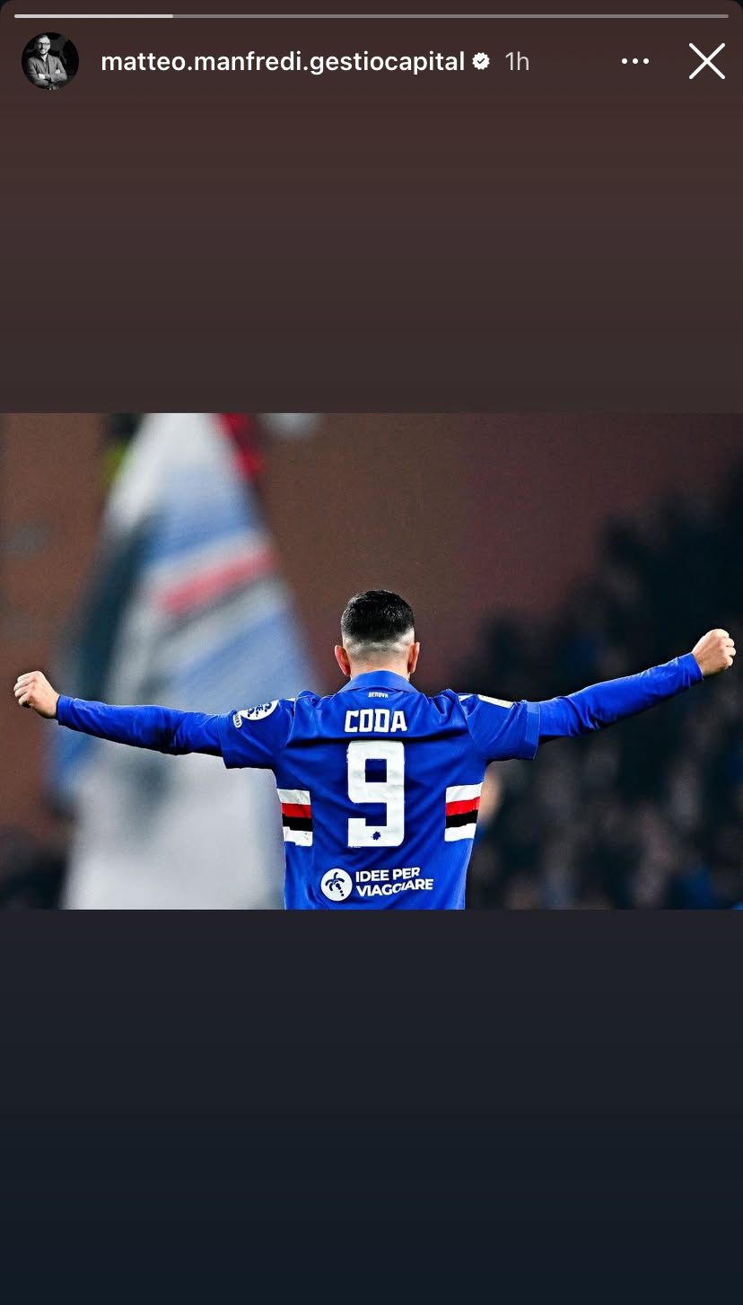 Matteo Manfredi ha pubblicato una storia sul proprio profilo Instagram con la foto di Coda dopo la vittoria della Sampdoria sulla Carrarese