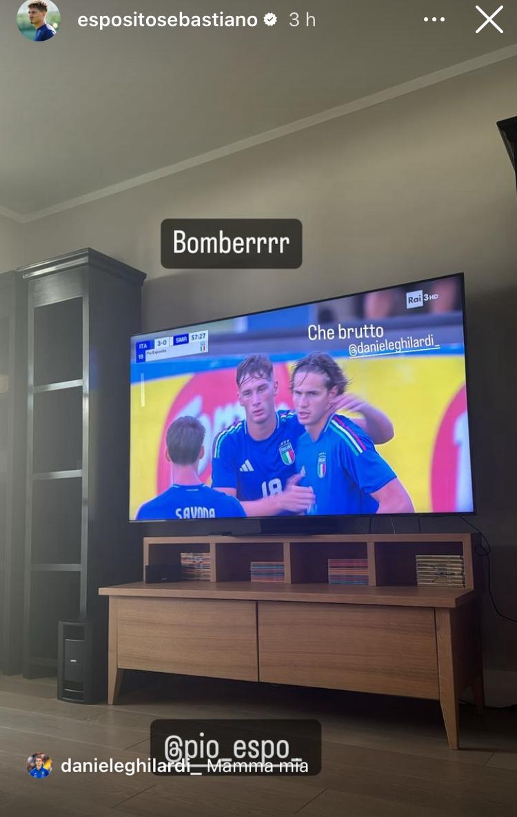 Sebastiano Esposito sui, social, ha postato alcune storie nelle quali ha mostrato di stare seguendo la sfida, valevole per le qualificazioni a Euro 2025 tra l’Under 21 dell’Italia e pari categoria di San Marino.