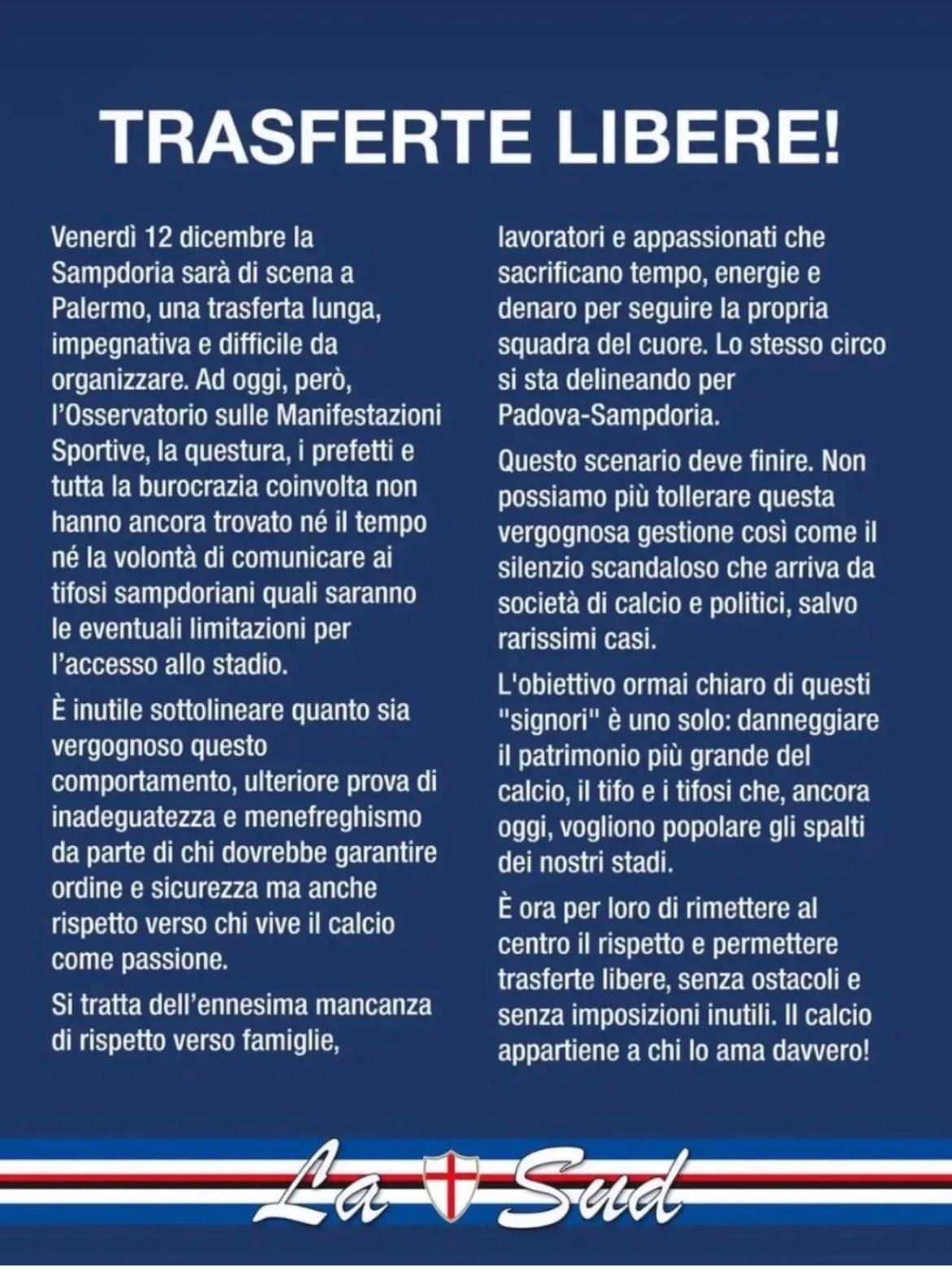 Trasferte vietate ancora una volta per i tifosi della Sampdoria che non possono andare a Palermo, La Sud si fa sentire…