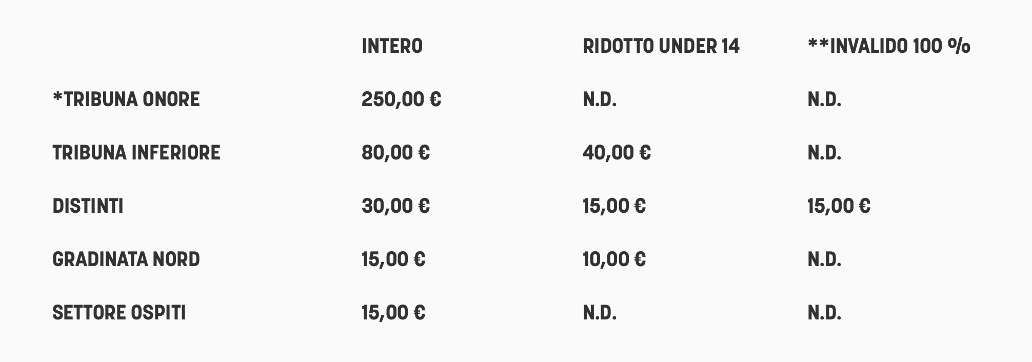 La vendita dei biglietti partirà martedì 21 ottobre alle 15:00 e avverrà online su Ticketone, nei rivenditori autorizzati dal circuito sparsi sul territorio e anche nel service center di SampCity, in via XX settembre. Sarà poi abilitata anche la biglietteria in via Monnet il giorno della partita, non prima delle 13:30. Di Seguito la lista dei prezzi.