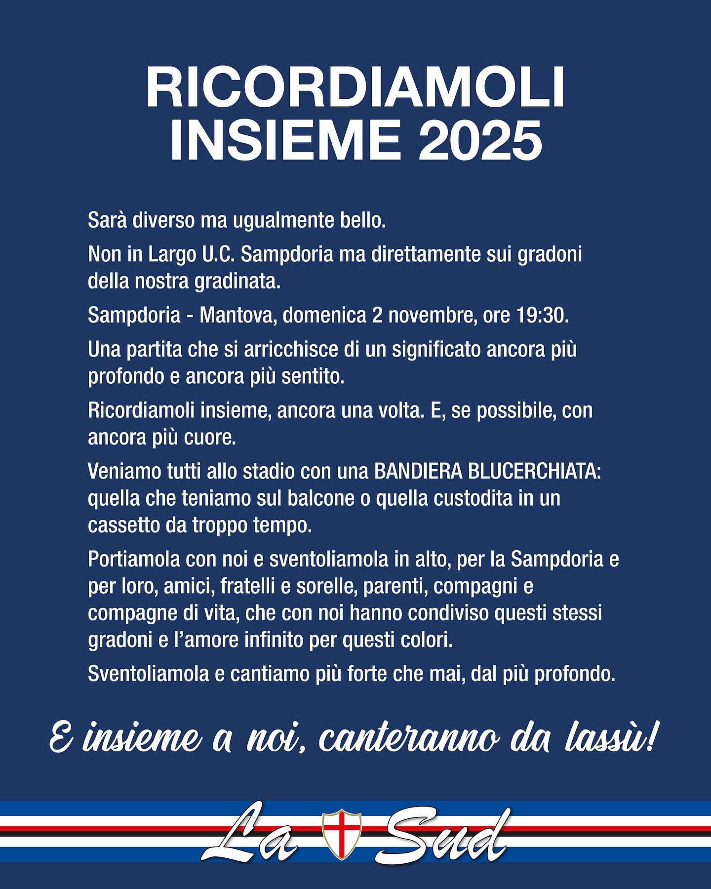 Il 2 novembre è il giorno dove si ricordano commemorano i defunti , in tal senso il tifo organizzato blucerchiato ricorderà tutti i tifosi che negli anni hanno perso la vita ma con i quali condividevano la passione per la Sampdoria. Ecco il messaggio pubblicato sui social:
