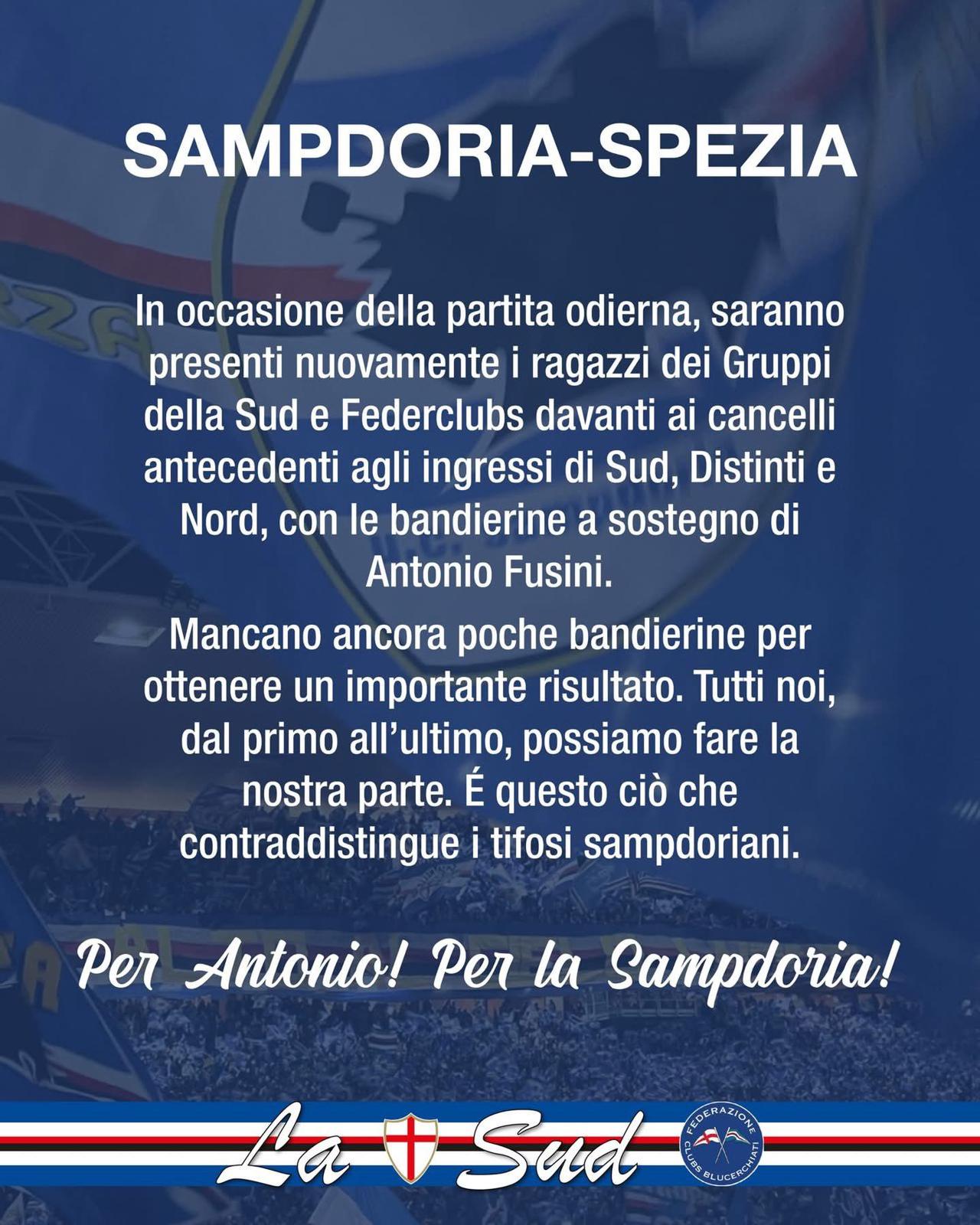 Prima di Sampdoria-Spezia, i gruppi de La Sud saranno presenti con le bandiere per aiutare la famiglia di Antonio Fusini
