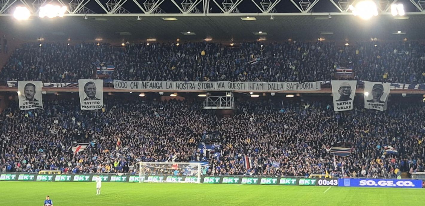 E che ha contestato anche in occasione della sfida al Mantova. A inizio secondo tempo, infatti, dalla Gradinata blucerchiata si è visto campeggiare uno striscione che recitava “Ecco chi infanga la nostra storia. Via questi infami dalla Sampdoria“. Ai lati della scritta campeggiavano in grande le quattro immagini dei dirigenti contestati, con nomi e cognomi sotto le facce, come fossero foto segnaletiche: Fredberg e Manfredi a sinistra, Walker e Tey a destra.